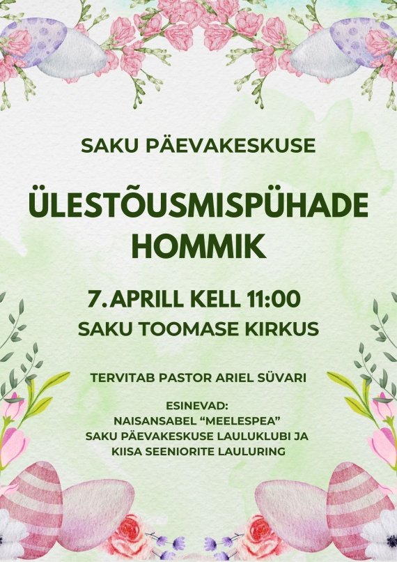 ÜLESTÕUSMISPÜHADE HOMMIK SAKU TOOMASE KIRIKUS 7.aprillil, 2026 kell 11:00 toimub Saku Toomase kirikus Ülestõusmispühade hommik. Ootame rohket osavõttu!